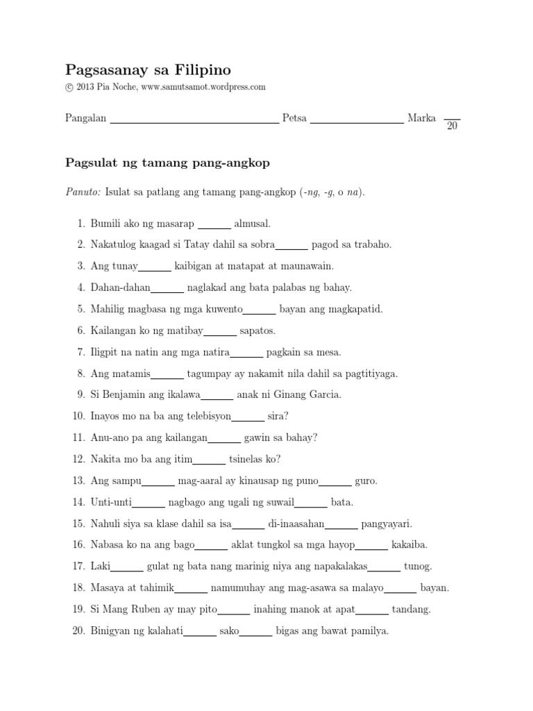 Mga Sagot Sa Paggamit Ng Pang Angkop 1 1 Pdf Pagsasanay Sa Filipino C 2013 Pia Noche Www Samutsamot Wordpress Com Petsa Pangalan Marka 20 Mga Sagot Course Hero