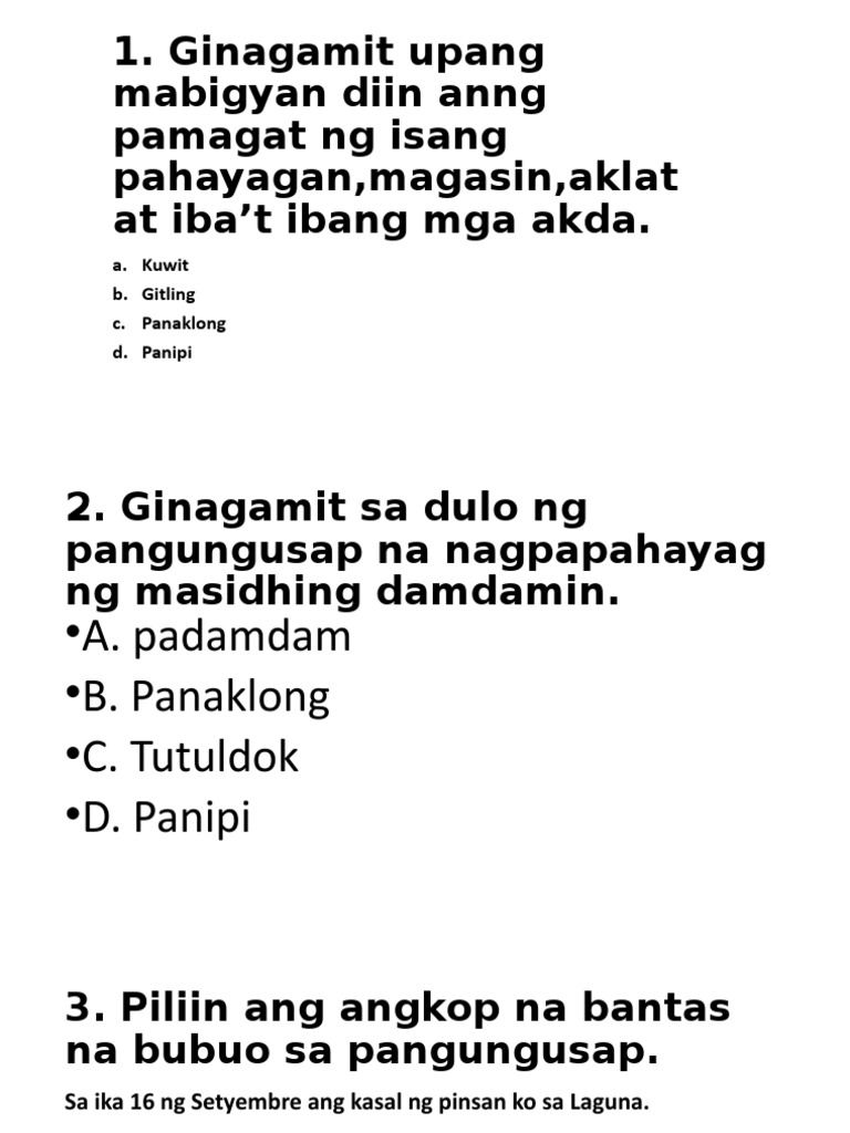 Ang ganda ng bago mong sapatos. Pagkatapos isulat sa patlang ang angkop na bantas sa mga nakitang pagkakamali1Bb. 3 on a question GAWAIN 3Karagdagang Gawain PANUTO.