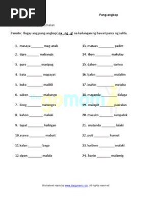 Showing 8 worksheets for Na Ng G At. Na ng o -ng at g. The three pdf worksheets below are about pang-angkop -ng na -g.