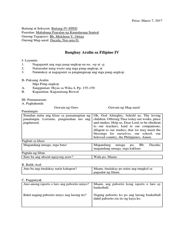 Nagagamit ang mga angkop na mga pangatnig sa pagbibigay ng sariling opinionpananaw. Pado PhD Banghay Aralin sa Panimulang Pagbasa Filipino Page 1. Banghay Aralin sa Filipino IV.
